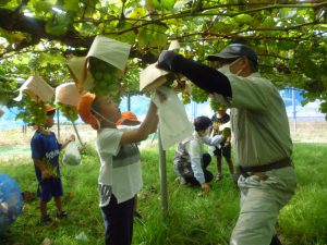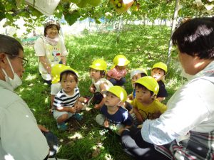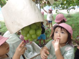 2021年11月2日 ぶどう狩りをしました! みんなでぶどう畑に行き、シャインマスカット狩りをしました。 『これがいい!』『おおきいのあるかな~』などと言いながらお気に入りのぶどうを探していた子ども達。 秋の味覚狩りを楽しんでいた様子でした。