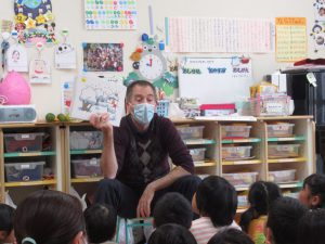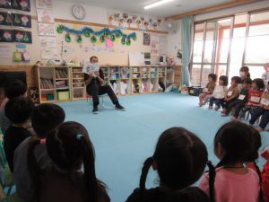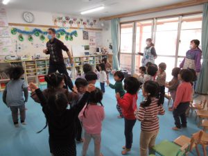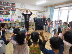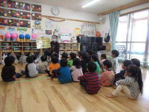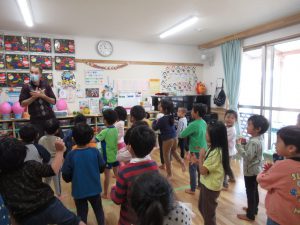 2021年12月10日 英語であそぼ! みんなが楽しみにしている『英語であそぼ』! 今日はネイティブの先生、「パトリック先生」が来園してくれました。 『サンタクロース』、『レインディア』、『プレゼント』に『クリスマスツリー』... この時季にピッタリのクリスマスや冬の内容を中心に、 歌ったり、踊ったりしながら、楽しく英語に触れることができました。 終わりの時間になると、「またきてね~」とパトリック先生と別れを惜しむ子ども達でした。