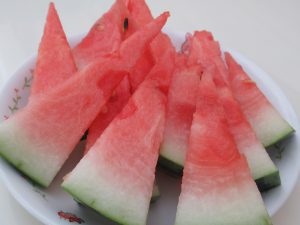 じつはスイカは90%以上が水分でできており、ミネラル、カリウム、それからシトルリンというアミノ酸(血流を促し体のむくみを取ってくれるそうです)が含まれているので、たくさん汗をかくこの季節にピッタリの水分補給だそうです!