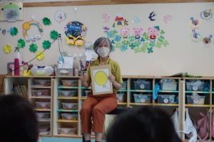 In today’s lesson, we sang the ABC song with Ms. Max, pointed to the first letter of our names, and read picture books of various colors . She read us picture books of various colors (^_^)