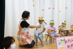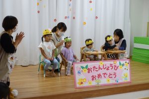 誕生会では、毎回担任の先生が誕生日を迎えた子供たちに好きな食べ物や将来の夢等を質問しています!