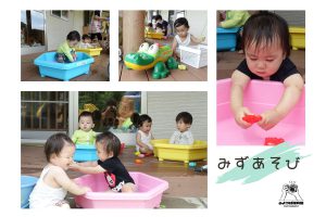 水に浮くカニのおもちゃで遊んでいる子や水をパシャパシャしながら嬉しそうに遊んでいる子。