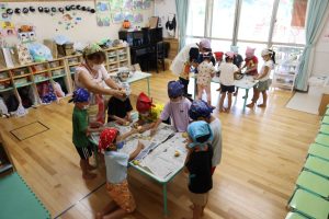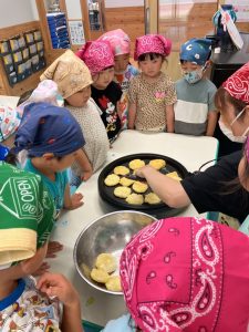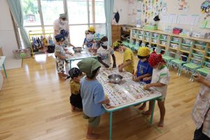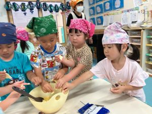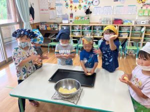 2025年7月10日 芋もち作りをしました。 たいよう組の子どもたちが、丹精込めて育てたジャガイモを使って芋もちを作りました。子どもたちは、収穫したジャガイモの皮をむき、丁寧に潰しました。そこにチーズ、塩、 マヨネーズ、片栗粉を加えてよく混ぜ、一つ一つ丁寧に形を作り、ホットプレートで焼いて出来上がりです。 出来立て熱々の芋もちは、子どもたちの笑顔と美味しい香りに包まれ、とてもおいしく出来上がりました。