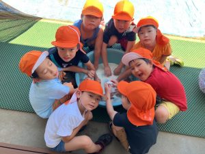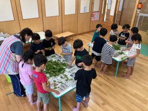 先日、園の畑で藍を育て、その藍を使って、たいよう組さんがお泊まり保育でTシャツの藍染をすることになりました。その準備として先日、ハンカチを使って藍染の練習をしました。子ども達は初めての藍染に真剣に取り組み、素敵な色合いのハンカチを完成させることが出来ました。本番のT シャツ作りも今からとても楽しみです。