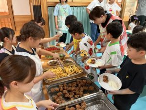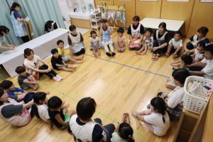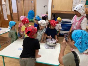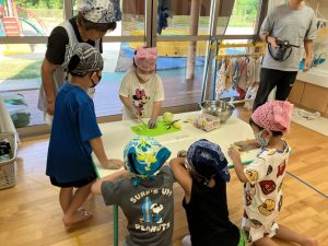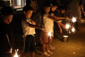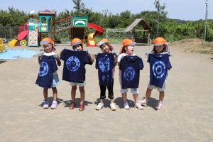 2025年9月1日 お泊り保育をしました。 先日、お泊り保育を行いました。最初は緊張していた様子でしたが、夕食づくりや片づけ、お楽しみ会、花火等・・・ 様々な経験を通して、友達と協力したり、先生と一緒に頑張ったりすることで、子どもたちは自信をつけ、、笑顔を見せていました。世界にひとつだけの藍染Tシャツも素敵です。大きく成長した子ども達です。
