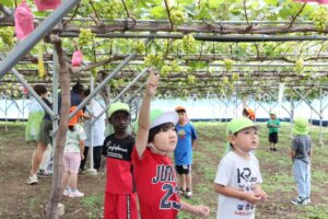 好きなぶどうを選び収穫し大喜びでした。もぎたてのぶどうは新鮮でとても甘く美味しかったです。お留守番のてんとうむし、たんぽぽ、さくら、そら組の子ども達はおやつで食べました。みんなで楽しい時間を過ごしました。KURANSAさん、貴重な体験をさせていただきありがとうございました。