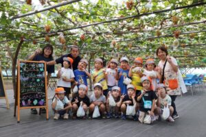 好きなぶどうを選び収穫し大喜びでした。もぎたてのぶどうは新鮮でとても甘く美味しかったです。お留守番のてんとうむし、たんぽぽ、さくら、そら組の子ども達はおやつで食べました。みんなで楽しい時間を過ごしました。KURANSAさん、貴重な体験をさせていただきありがとうございました。
